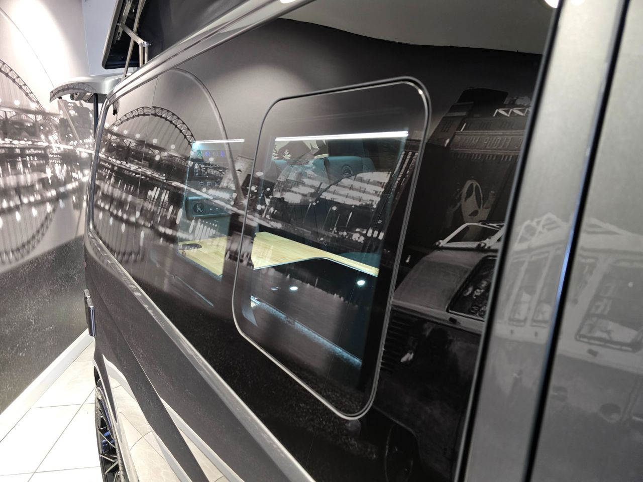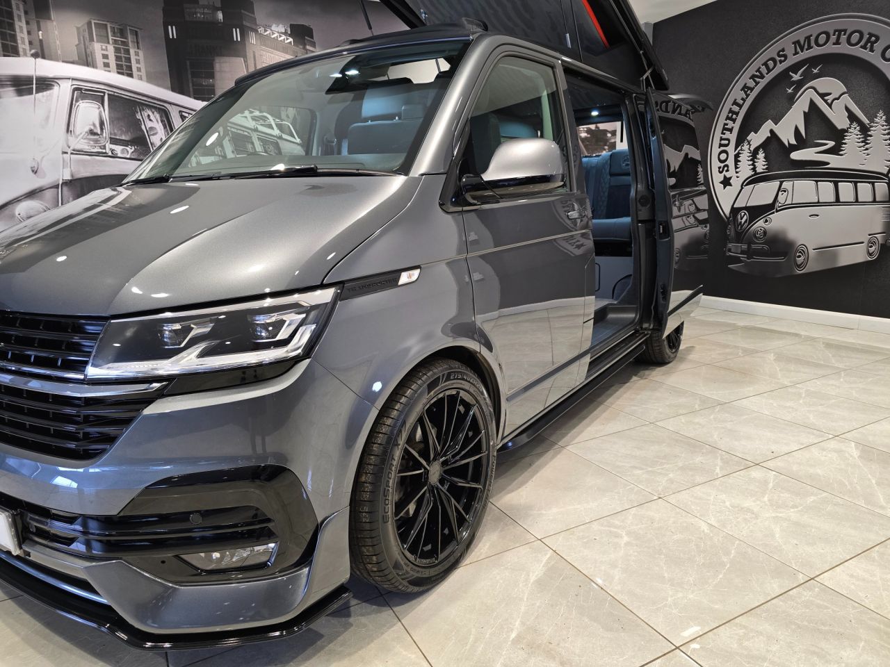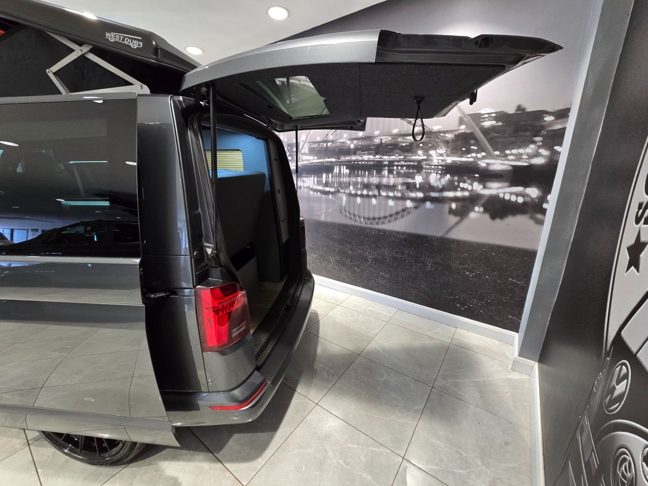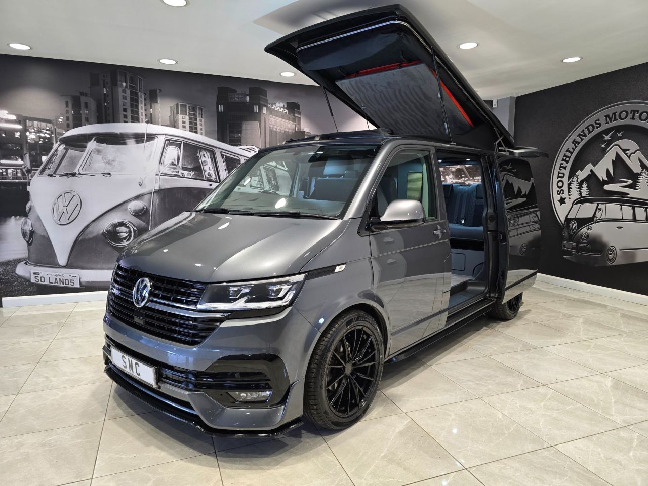 Westdubs pop top roof with scenic canvas Elevating upper bed system Privacy glass all-round Full furniture Solid oak worktop Oak tambour doors to match worktop Flush soft close doors with black flush catches Can double burner and sink unit Fold down tap 50L fridge freezer with LG compressor Dometic camper spec microwave CBE PC180 power management system Sterling split charge system 2 x 240v & 1 x double USB Wireless charger Cool white LED lighting throughout Onboard 2 x 110amp leisure batteries Onboard gas locker for 907 gas bottle Onboard 20L water tank Storage for thetford 335 porta potty within cabinetry VANSHADES Planar 2kw diesel heater with 7-day programmable timer M1 tested Sliding Rib bed 20" ALLOYS Vanstyle sidebars LV front splitter Custom painted front gloss black Grill + lower inlays Custom-painted water/electric hook-up flaps Custom-painted mirror bases