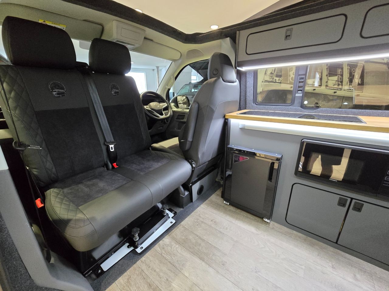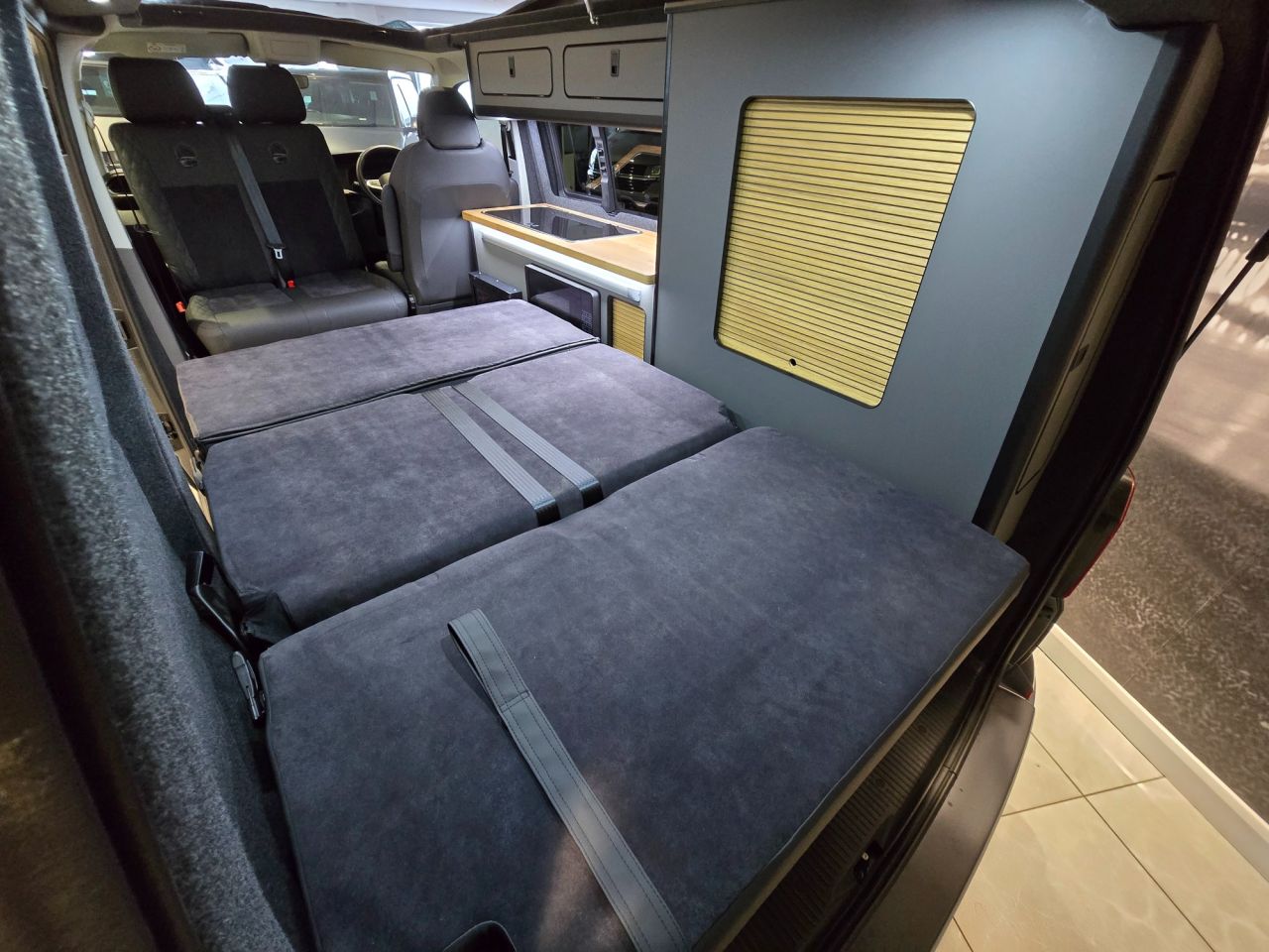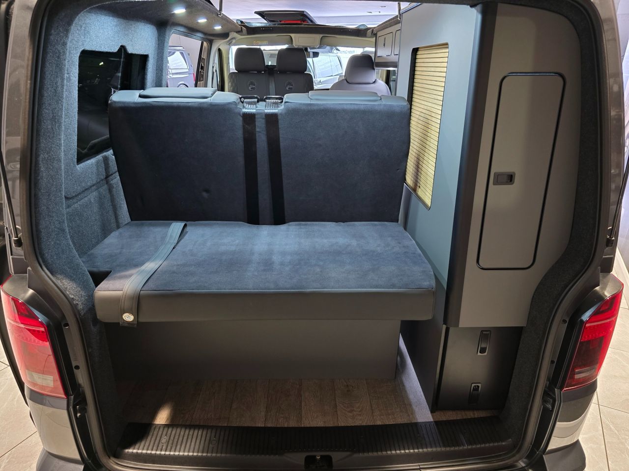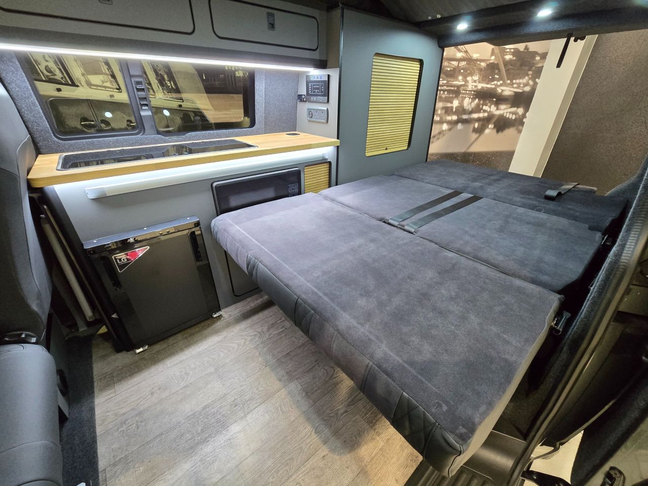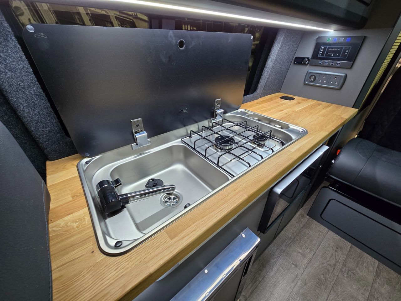 Westdubs pop top roof with scenic canvas Elevating upper bed system Privacy glass all-round Full furniture Solid oak worktop Oak tambour doors to match worktop Flush soft close doors with black flush catches Can double burner and sink unit Fold down tap 50L fridge freezer with LG compressor Dometic camper spec microwave CBE PC180 power management system Sterling split charge system 2 x 240v & 1 x double USB Wireless charger Cool white LED lighting throughout Onboard 2 x 110amp leisure batteries Onboard gas locker for 907 gas bottle Onboard 20L water tank Storage for thetford 335 porta potty within cabinetry VANSHADES Planar 2kw diesel heater with 7-day programmable timer M1 tested Sliding Rib bed 20" ALLOYS Vanstyle sidebars LV front splitter Custom painted front gloss black Grill + lower inlays Custom-painted water/electric hook-up flaps Custom-painted mirror bases