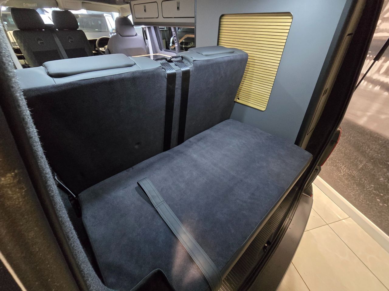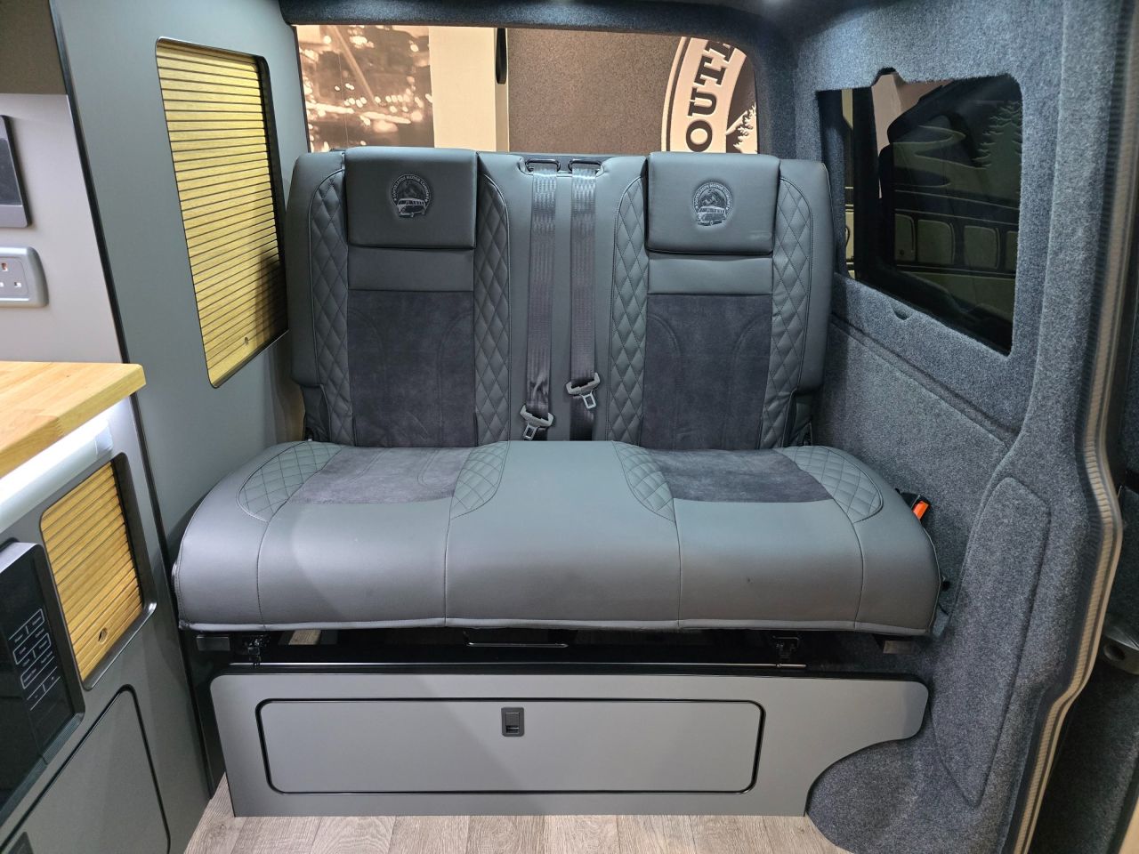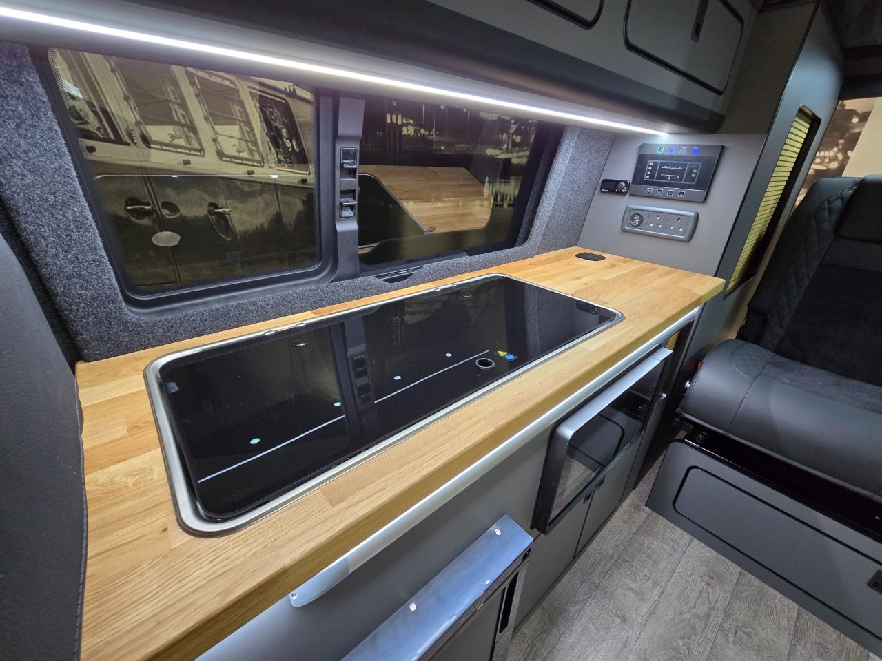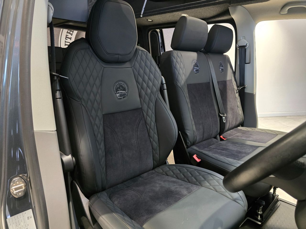 Westdubs pop top roof with scenic canvas Elevating upper bed system Privacy glass all-round Full furniture Solid oak worktop Oak tambour doors to match worktop Flush soft close doors with black flush catches Can double burner and sink unit Fold down tap 50L fridge freezer with LG compressor Dometic camper spec microwave CBE PC180 power management system Sterling split charge system 2 x 240v & 1 x double USB Wireless charger Cool white LED lighting throughout Onboard 2 x 110amp leisure batteries Onboard gas locker for 907 gas bottle Onboard 20L water tank Storage for thetford 335 porta potty within cabinetry VANSHADES Planar 2kw diesel heater with 7-day programmable timer M1 tested Sliding Rib bed 20" ALLOYS Vanstyle sidebars LV front splitter Custom painted front gloss black Grill + lower inlays Custom-painted water/electric hook-up flaps Custom-painted mirror bases